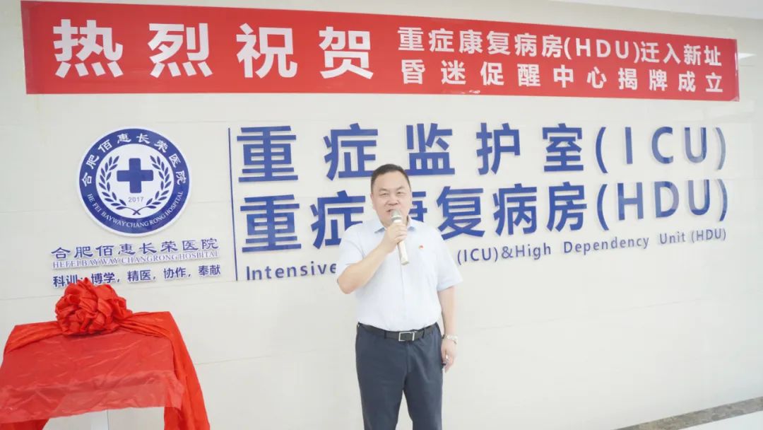 儀式伊始,合肥佰惠長榮醫(yī)院HDU/ICU行政主任戚生春在發(fā)言中表示,非常感謝上級(jí)領(lǐng)導(dǎo)們對(duì)于重癥康復(fù)病區(qū)的搬遷以及昏迷促醒中心的成立所給予的大力支持和幫助,重癥康復(fù)病房的升級(jí)改造及昏迷促醒中心的成立將開啟科室康復(fù)事業(yè)發(fā)展的新起點(diǎn)。他表示將帶領(lǐng)科室團(tuán)隊(duì)成員全力以赴,充分展示和發(fā)揮神經(jīng)重癥康復(fù)昏迷促醒的特色,立足于自身優(yōu)勢,建設(shè)一個(gè)具有特色的康復(fù)??疲瑸榘不帐∧酥寥A東地區(qū)患者的健康保駕護(hù)航。