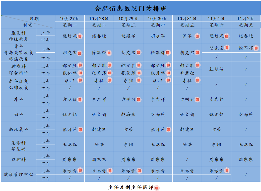 為方便廣大市民了解合肥佰惠醫(yī)院門診醫(yī)師出診安排,現(xiàn)發(fā)布本周(10月27日-11月2日)門診醫(yī)師排班表,請(qǐng)大家合理安排就診時(shí)間。如遇停診、換診等特殊情況有所調(diào)整,以當(dāng)日出診安排為準(zhǔn),造成不便敬請(qǐng)諒解!